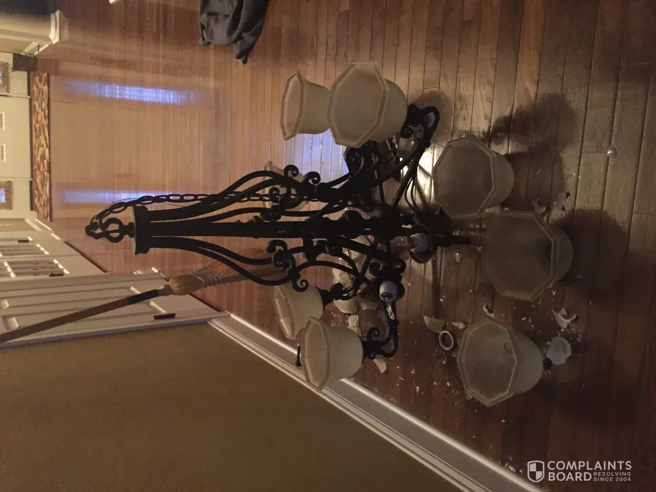 We own a Ryan home which was built in 2009. On Monday, 7/17/17, I arrived home with my sons from a vacation around 1200 pm to find that one of our chandeliers had fallen two stories onto our hardwood floor. I had a contractor come to let me know what happened and he noticed that the chandelier was held up by two very small inadequate screws that maybe measure 1". This chandelier should have been held up by much longer screws. I contacted Ryan homes on 7/19/17 around 1100 am and spoke with a lady who wasn't concerned at all. We have two other huge chandeliers which we are very concerned about that might also fall. The first time, we were very fortunate that no one was home, except the dogs and they didn't get hit. Who knows what might happen if another one falls. The lady I spoke with told me that they couldn't do anything about it since the warranty expired after one year. She also said that who's to say that the previous owner (who happens to be a lady in her 60s) didn't mess with that chandelier causing it to fall. I feel that it was negligence of your company to use the wrong screws and putting my family in harms way. I want this to be a formal complaint so that when this happens again (and it will d/t your short cuts) there is documentation of your knowledge to this issue and your lack of interest/concern and desire to make it right. I will be posting something in our neighborhood site to ensure everyone knows of your shoddy work so that if it happens to them, they know you were made aware of this issue and did nothing to correct it.