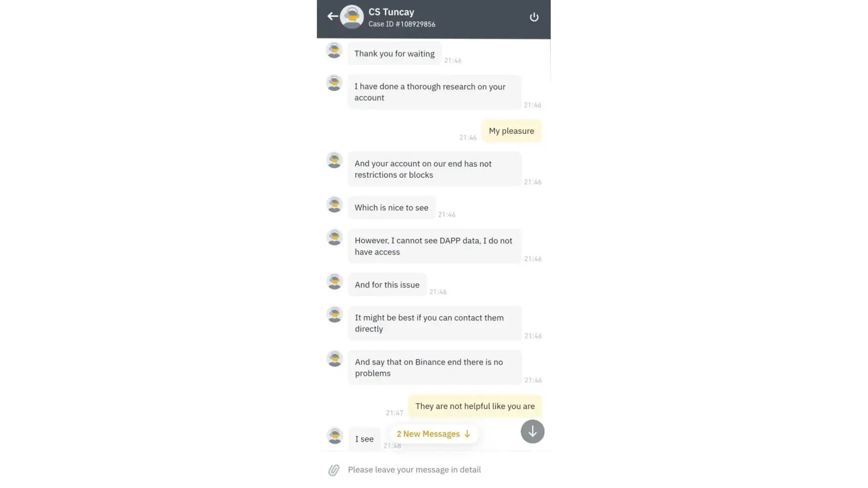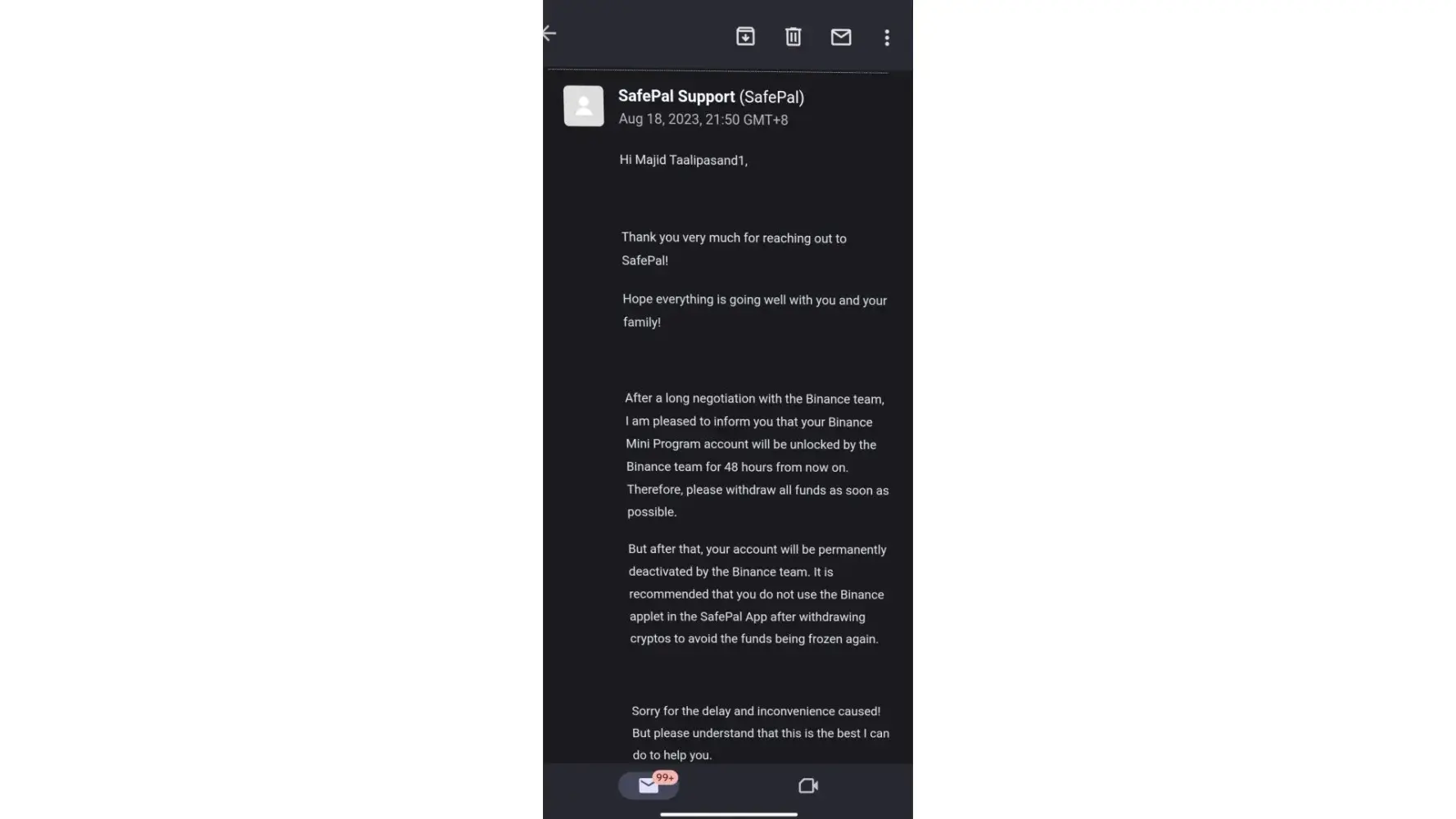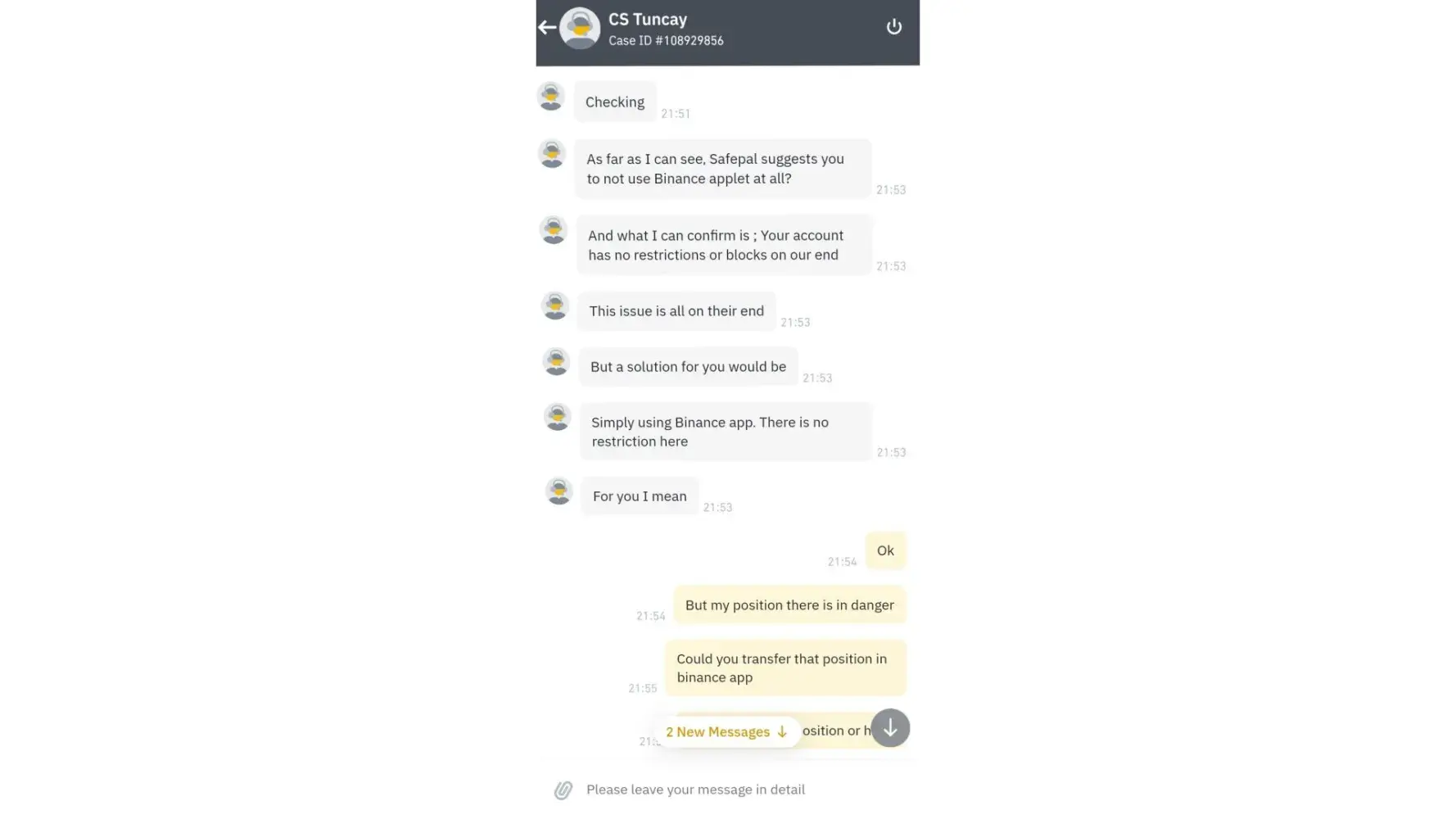 I am verified binance user that binded my account to Safepal mini program my ID on safepal is (bnb1qvfzrdqla4ypp832pp3spc40u6mxw7kfva37mv )recently my futures account is restricted it means I can't add position or open new position I asked safepal team on August 17 to resolve my solution after a day they said that binance has said that you must withdraw all your funds whilst I have two active position then I contacted binance team on August 18 with case ID [protected] replying that there was no blocks or restrictions on their side for my account at all I want to know why Safepal team did tell me lie about negotiating with binance team are they want my position be liquidated? Why there is no online human support team See the screen shots and you will notify that I have no issues with binance what should I do it's about 5000$ in position they even didn't investigate my account and just sent me an automated reply. Now I can not manage my positions there...I have to tell you that binance team were really helpful and responsible and dedicated.