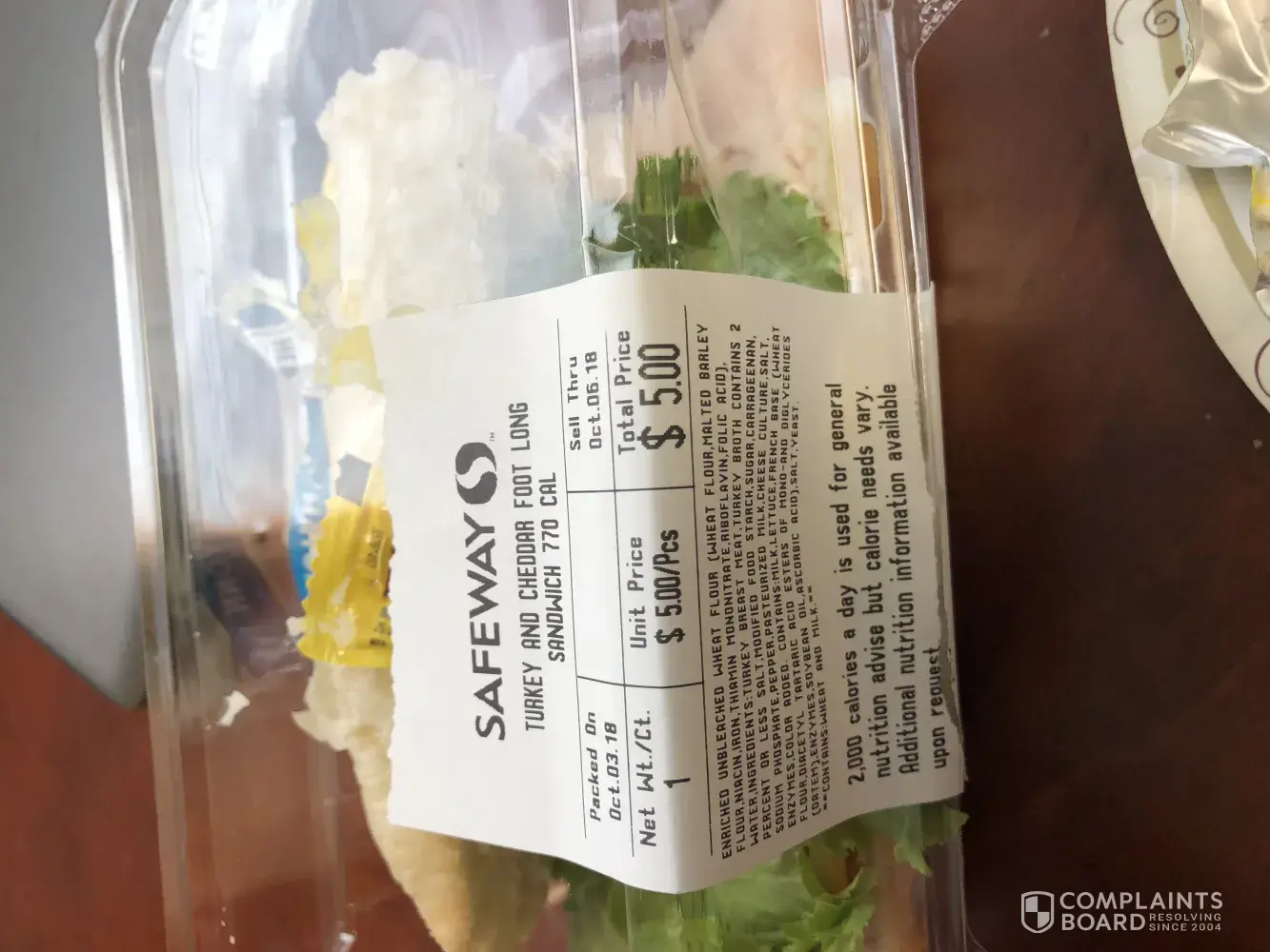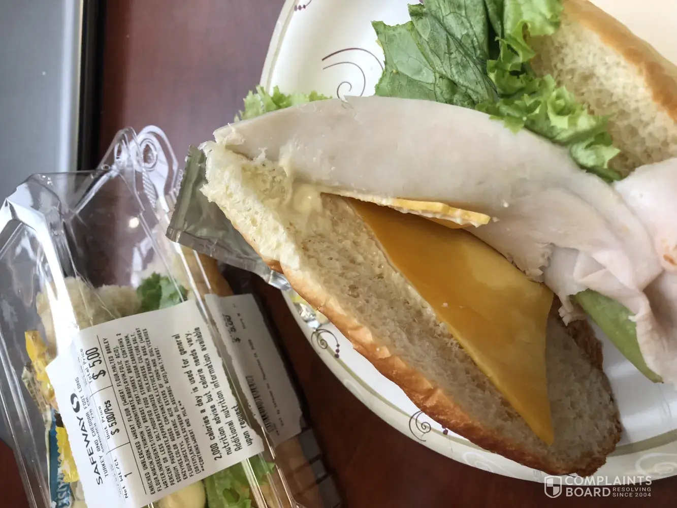 So my wife picked me up a sandwich from safeway in moses Lake, WA 98837 deli section so I could have lunch at work. I sat down to eat my sandwich at lunch, 4 hours after purchase. When opening the container I had on thin slice of turkey meat on each side of the sandwich and two small pieces of cheese and a huge piece of lettuce. Cheese was a little discolored which didn't bother me too much. Having a thin slice of meat is what made me type this as my food sits in front of me. I expected to have a nice sandwich for lunch and instead I paid $5.00 of my hard earned money for a tiny slice of meat covered with lettuce. As I pick up my sandwich the back half of the bread is hard as a rock so that will be torn off and not eaten. Seems there needs to be some training done on how to make a turkey sandwich. I was not expecting a stale bread and lettuce sandwich which is still in front of me as I am typing this.
