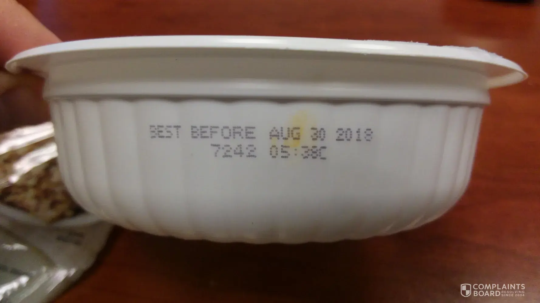 Label printed on side of bowl reads, "Best Before Aug [protected]:38C". The label on the bowl said it was a fully cooked product. Thus, working late, I didn't bother to microwave it. When I got to the bottom of the bowl, I saw flakes of what appeared to be plastic in the bottom. Thinking they might have been from the adhesive holding the lid closed, I looked closer. What I found was that the flakes were coming off of the inner walls of the bowl itself. I cannot say exactly what the flakes are, but managed to scrape enough off for a photo. If the rice is cooked in the bowl, the flakes could just as easily be starch as they could be plastic. In either case, I will not be eating this product again until I have a definitive answer as to what it is.