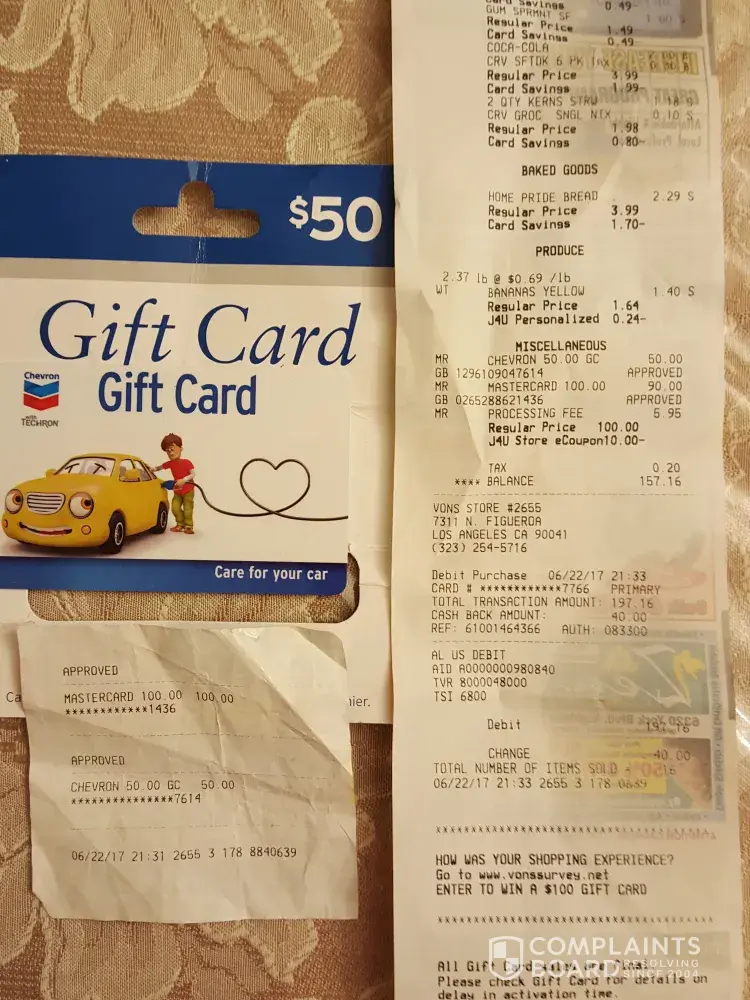 I purchased my $50 chevron gift card at Vons store #2655 located in Los Angeles on 6/22/17. When I was ready to use my card on 6/24 it had a "0" zero balance according to the attendant. I went back to Vons where I purchased the card only to find out I had to contact the Safeway gift card department. I was on hold for over 30 minutes only to find out the gift card department is not available on the weekend. I left a message with Chris Ramos to have someone call me back on the weekday. However I did not receive a call so I called during my lunch at work only to find out that they did not receive any information about my situation. The lady I spoke with said she needed to open up a ticket and would need me to email my receipt and card with my complaint. I finally received a call from Graham a day later about my ticket only to find out they did not receive my emails. I finally had to fax because they had an issue with the emails. So after wasting a few days of my time to resolve this issue I received a message from Graham stating that they could not help me with my reimbursement and that I had to call Chevron to have this resolved. This is a total waste of my time. Basically they are saying too bad take it up with Chevron. I am so disappointment with Safeway's Customer Service. Why didn't they escalate this matter themselves with Chevron since they have a copy of my original receipt and card I purchased at that location. I am now having to deal with Chevron and who know's how long this is going to take. I just want my $50 returned or a new chevron gas card!