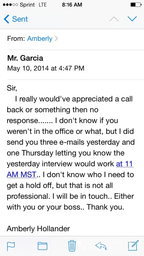 So, I've been in need of work for a couple months now, so I applied online to Safeway because some of the positions looked great to work in! I applied to 4-5 different positions and got an email from a man who is apart of the Corporate Human Resources team. He e-mailed me to schedule a Pre-screen interview and what times would work. I agreed to 11am MST Friday, May 9th, 2014... He sent me an e-mail stating that's what time he would call. I HAVE ALL E-MAILS! Well, he NEVER called... No phone call, no e-mail, nothing. Not even the Monday of the next week. WTH? I may be only 23, but I'm not stupid or letting these people in higher ranks be so unprofessional! People are in need of jobs, but those in higher ranks apparently don't give a c***. If this man or company SAFEWAY was not interested in my application, wouldn't a professional leader in his position let me know? Say something? But no, haven't heard a word back. I have all the e-mails and his confirmation.. Really sucks...