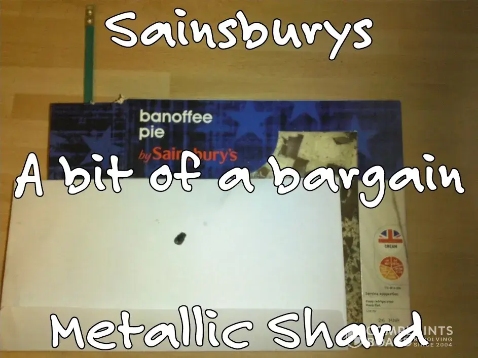 The Banoffee Pie contained a metallic looking shard in it, of about 1cm in length and 6mm in girth although it formed an irregular polyhedral shape. The was no apology from the staff in the store, only an attempt to shift the blame outwith the Brooks Road store. There was some notion that it was not a Sainsbury's product yet the Banoffee Pie is encased in a cardboard box clearly marked with the words "banoffee pie by Sainsbury's", [capitilization as on the encasing box].