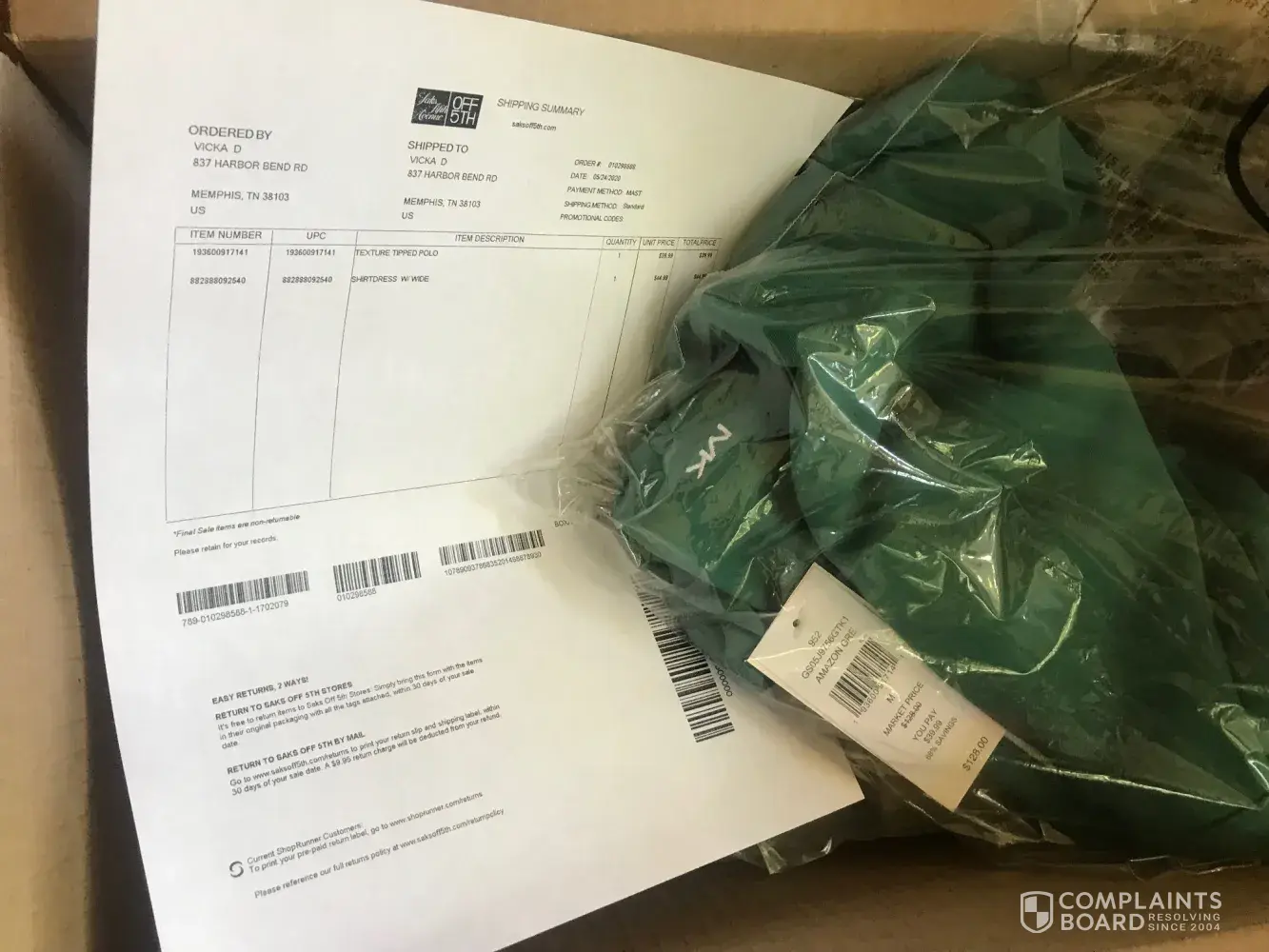 I purchased a designer dress on 2/10/20. It arrived on 2/13/20. It was too small and I returned it with tags attached on 2/14/20. It was returned to me with a letter saying it was unsalable, but there was no explanation no as to why. I called their customer service number and was told that it had black marks. I looked closer at the dress and saw black smudges inside the bodice. This was a dress that I tried on right after a shower, in my bare feet, on my bedroom carpet, and I had to pull It over my head to get on & off. How the hell did it get black smudges? I have never had anything returned to me before. They told me to send it back for a reinspection, which I did, and it came back to me again with the same letter. I see someone else had the very same thing, with black marks, happen to her. This "black mark" scam is an attempt to reduce their losses. In the meantime, I am out $613. I would never purchase anything from Saks Off 5th again, and I hope they go out of business. I am also complaining to the Attorney General of Virginia.