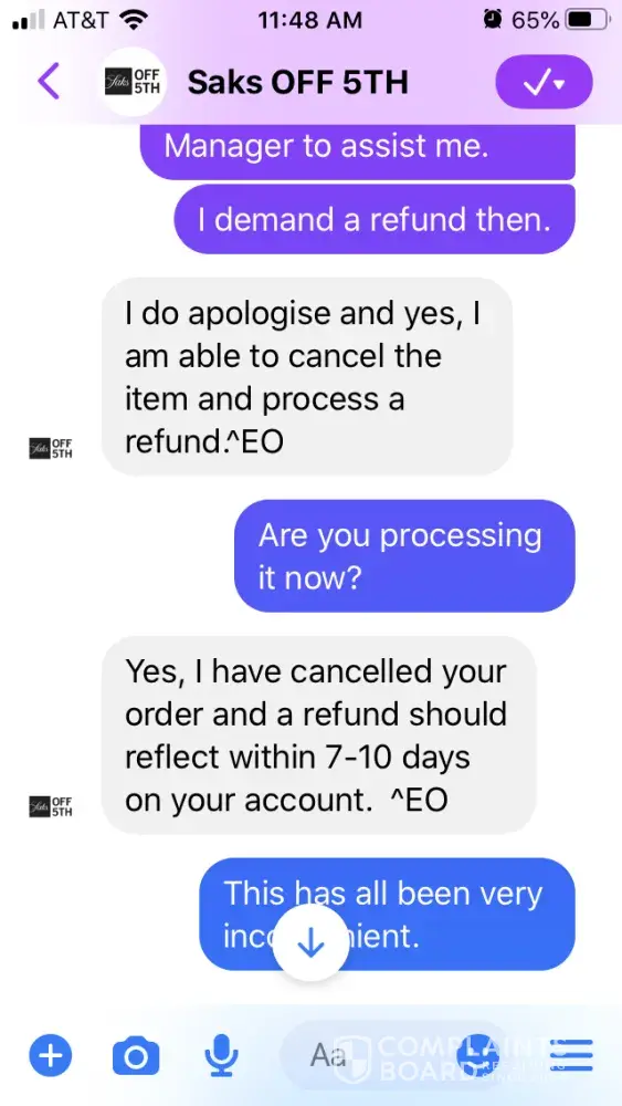 I am not a happy customer with Saks off Fifth and spoke to multiple customer service agents since March about an issue on multiple orders that still hasn't been refunded to me. Each time I had to wait on hold for over an hour to get an agent and called about 10 times to explain the issue with multiple orders to Saks. Each time they addressed that I would see my refund within 5-7 days and I still don't have it. I need this corrected or I'm contacting the BBB and filing a claim.