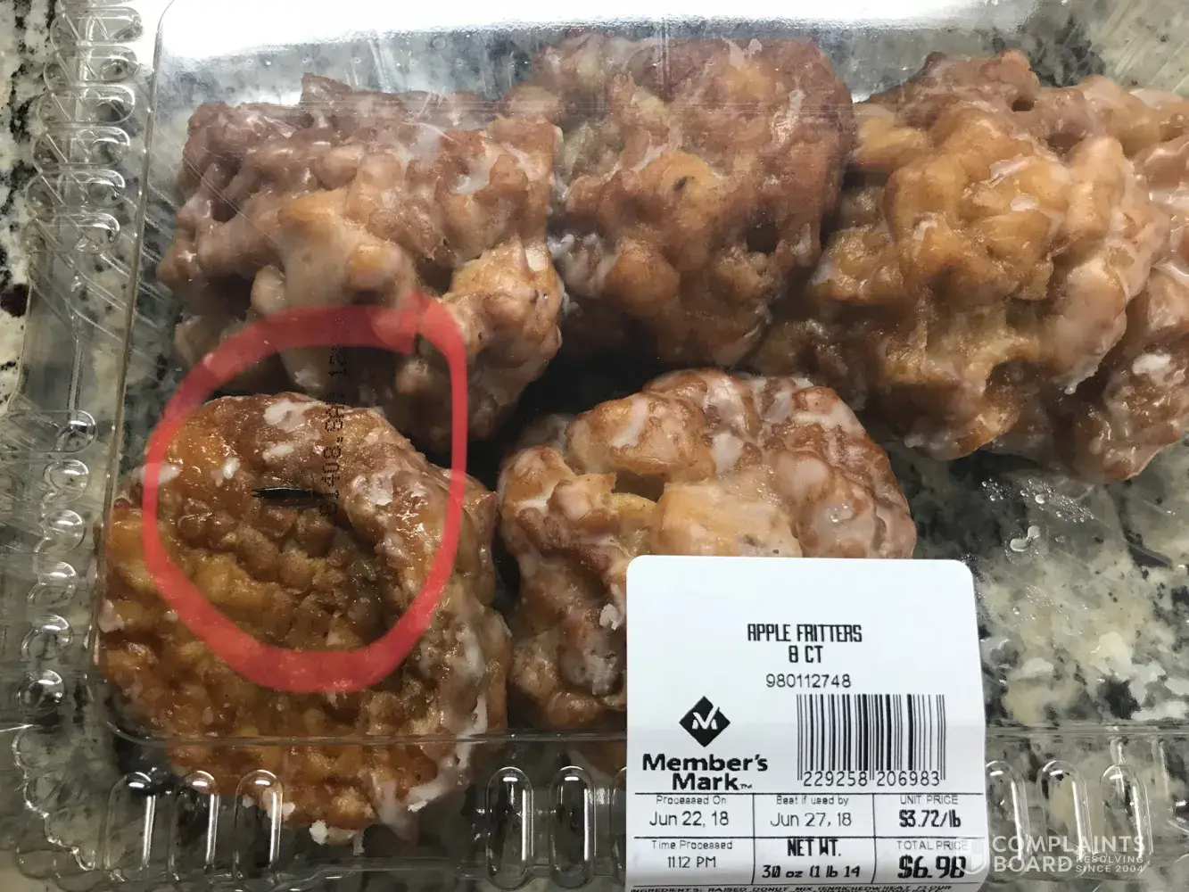 I bought the Members Mark Apple fritters from your store from the Plano store at Frisco yesterday afternoon. And when I opened the seal to the pack today to offer a piece to my kid for her breakifast, we found a live earwig on one of the the fritter!