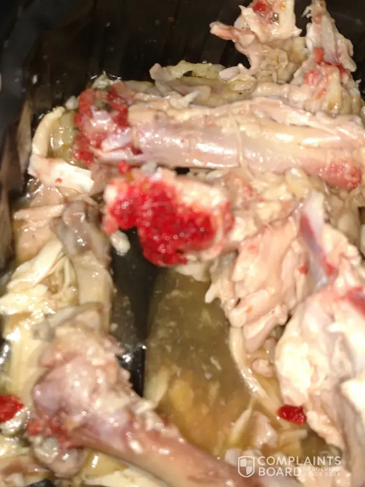 We purchased 2 rotisserie chicken at our local Sam's club on Saturday the 21st of October to eat for dinner. We cut up the breasts on one and ate our dinner then I cut the rest of it off the bone and saw that there was blood in the bottom of the container that we purchased the chicken in and blood in the middle of the chicken. Needless to say we were a...