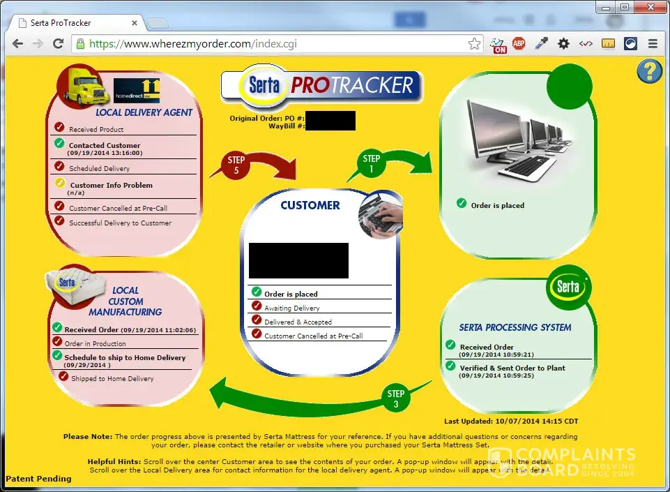 This morning, 10/7, I wake up to check the status of my order on the Serta Pro Tracker. Lo and behold, I see not one, not two, but THREE orders out there although it looks like the first two are just duplicates of each other. The 3rd order is a new one and it has a submission date of 5:25. Not sure what time zone that is for so it was either send during my call the previous evening or after I got off the phone, but either way maybe I actually got through to someone who could do something sometime during the day Yesterday. Finally something happend. Wait...does that mean my 10-12 business days gets reset and I'll now have to wait another two weeks for it to be delivered?