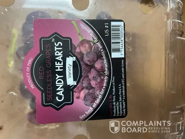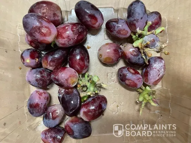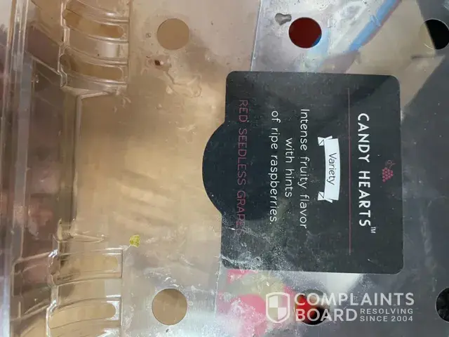 We purchased 3# Red Seedless Candy Hearts Grapes today. Grapes are packed in carton so tightly 24 grapes were mashed & moldy with white webs. We live too far away to turn around and take them back to the store.