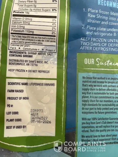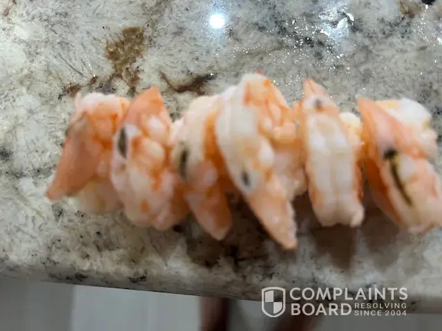 Contact Sam’s Club customer service directly, show them the photos, and demand a refund or credit since the product was falsely advertised as deveined. Mention that you’re considering switching to Costco if they can’t maintain quality control.