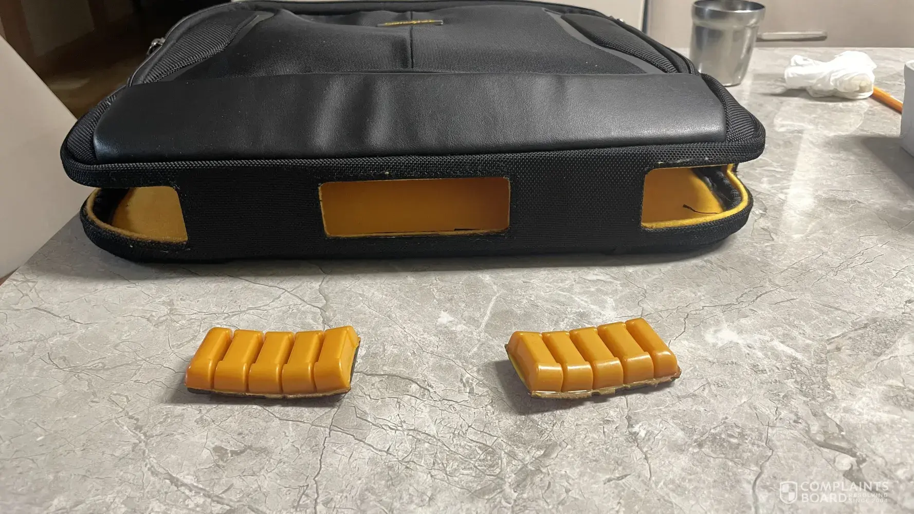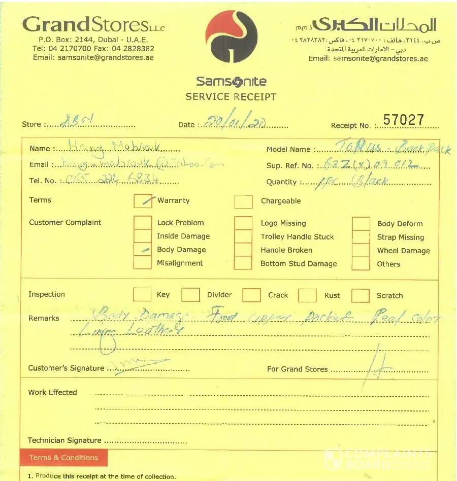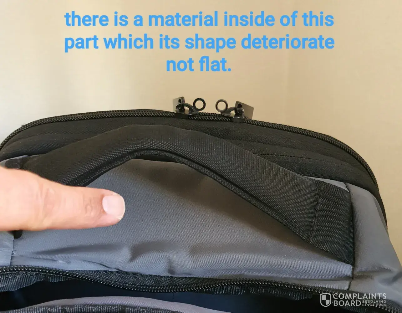 I am useing my bag for my daily travel from home to my office and carrying with it just my laptop, power bank, portable HDD, my wallet and my charging device of my mobile phone. It weights approx. 4 to 5 KGs.And half of my way from home to office is with my car which means my bag sitting near by me. I never leave my bag down because I'm so particular about my bag. I can either carry it or hang it on my back.I used many bags because of my neck hernia, but the bag I bought from samsonite made me the most comfortable. So, Although I am very satisfied with my bag, it is not possible that the deformation on the bottom and outermost lid of the holding handle is caused by my use.Here i am sharing the ticket which shop gave me and pictures of my bag. I want the issue to be reviewed by you and my grievance removed.you can contact me via my email address [protected]@hotmail.com or my mobile phone# +[protected] at any time.