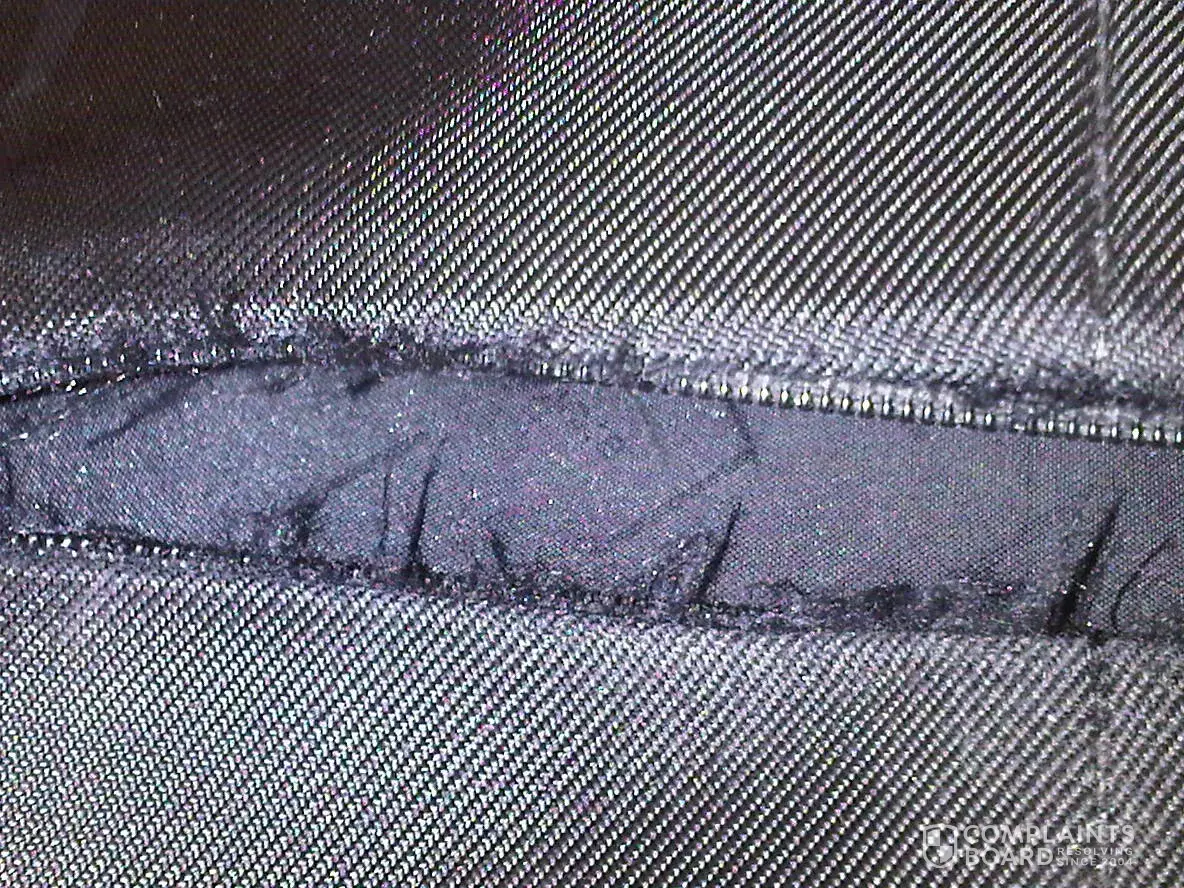 Main compartment: Occasionally the two zipper halves refuse to interlock or stay connected. Front compartment: The fabric surrounding the seams and the zippers is largely damaged.