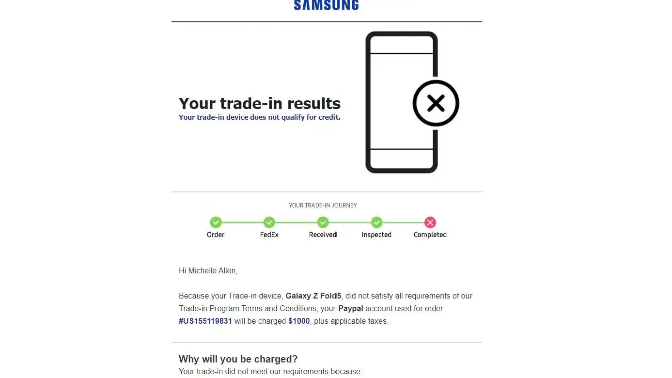 I ordered a new Samsung fold 5 and sent in my broken Samsung Fold 5 that stopped working after 3 months of ownership. Samsung says it does not take the Samsung Fold 5 as a trade in but refuses to send it back to me. #US155119831
