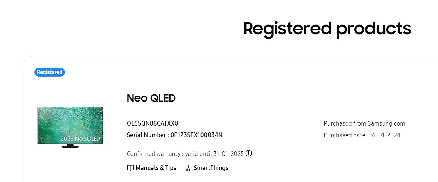 On 31/1/2024 I bought a TV from the Samsung UK website. It had a retail price of £999 with 10% discount, 5 year warranty and 6 months free Disney+. I also traded in my old TV for a further £100 discount. My Samsung account shows the TV as registered, a requirement for the extended warranty, but with a warranty of 1 year. I went through the registration...