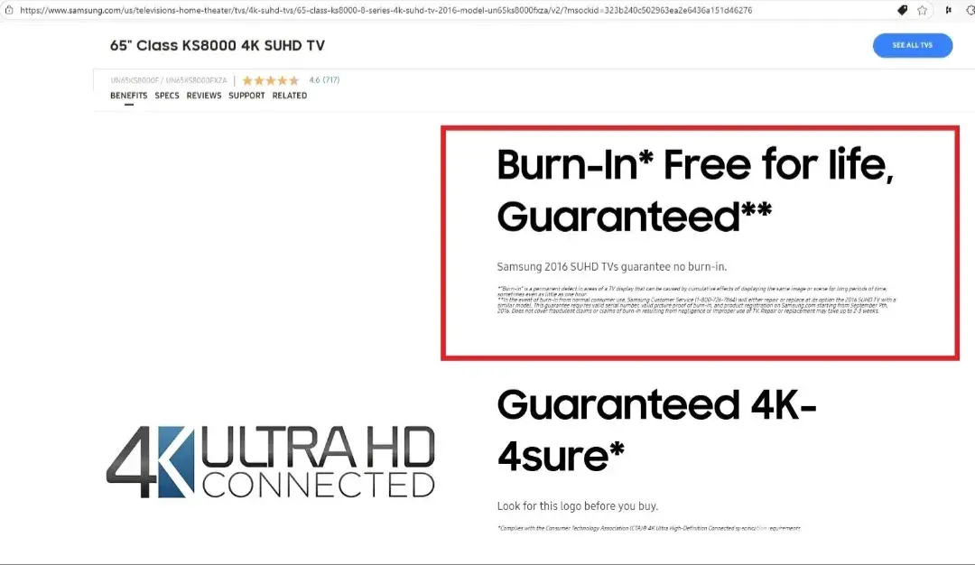 I purchased a Samsung UN65KS8000 TV which was marketed with a “Burn-In Guarantee for Life.†The unit has developed clear, permanent image retention consistent with burn-in, making it unusable. I provided Samsung with detailed photos and documentation including a BestBuy receipt confirming the issue and referencing their product guarantee. Despite this, Samsung’s Product Support Team concluded based solely on images and without a physical inspection that the issue was “not related to burn-in.†They informed me that I must pay out of pocket for a panel replacement, which I believe directly contradicts their advertised lifetime burn-in coverage. I have spent several weeks corresponding with Samsung’s Extra Care representative, Bernice Huskey, to resolve this matter. Samsung has declined to honor the guarantee or provide any accommodation, despite clear evidence of burn-in and their own promotional claims.