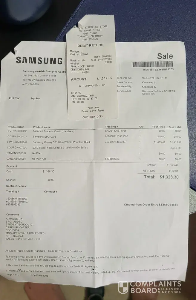 Hello, I recently purchased s21 ultra and unfortunately as soon as I've pickup my new phone, I received an email from my company saying they already bought me a phone so i had to return mine. Upon returning the phone I've learned that my trade in was forfeited and I cannot get my tradein(my iphone6) back but also they bought SPC card on my behalf without my knowledge which is also non refundable. So in the end I'm out of iphone 6 and SPC card which they could of gave it to me for use since I've paid for it.