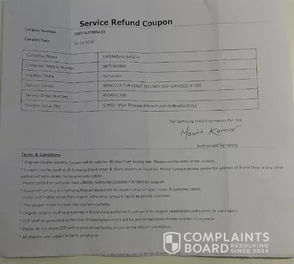 Harassment at every level of the refund coupon procurement. Then refund coupon fraud by samsung service centre in bengaluru, india