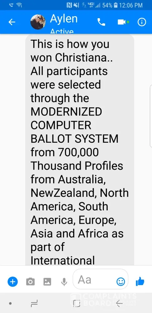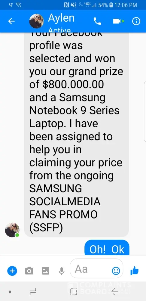 Please see photos below. I was contacted by the person on messenger, stating that I was selected for the prize of 800.000.00, and a samsung notebook, after accepting a friend request. I questioned the person on why wasnt I contacted before friending them, and they said they tried contacting me before I friended them. Here is the info in the pictures attached.