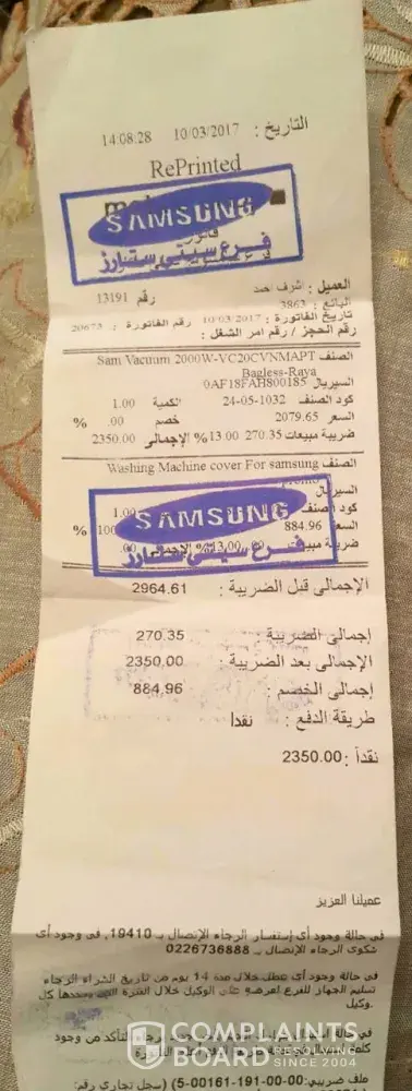 I bought a vacuum cleaner from Samsung dealer in Cairo Egypt on 10th of March 2017. It had 3 times repeated failure till now. I went to costumer service and each time I take and after using I find the same problem. Now after 3 repeated failure they do not agree to change it with proper one. The serial no. Is