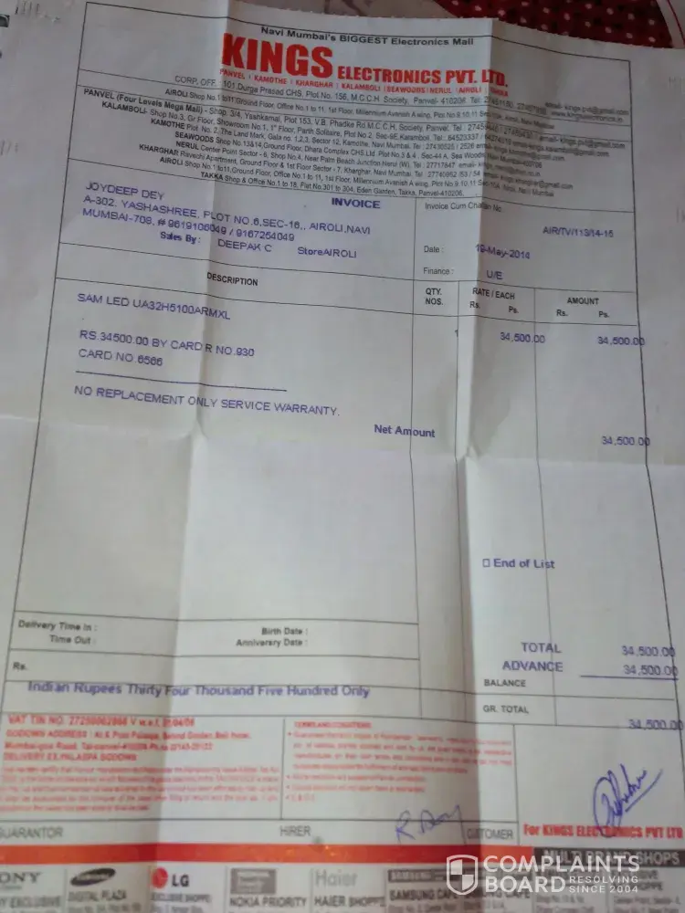 Respected ceo, with great shock and heavy heart I am mailing you again after a year for the issue in led tv 32†h5100. As it has become a recurring problem on this product. First time - I bought samsung led h5100 on 10/4/14 from reliance retail ltd. Mulund r - mall. The product got problem on 5/5/14 in the picture tube else backlight is gone. I asked to register a complain they told that I have to complain in samsung as it is their responsibility not reliance. That time my registered complain no with samsung is "[protected]", receipt attached. Any how it was sorted with very very long follow up with executive and that time also I had mailed to you, and I got the refund of the amount. Now again second time – I bought same model from kings electronics pvt ltd. Airoli. On 19/5/15 invoice no - air/tv/113/14-15. Just because of reliability in samsung but now just after 1 year the recurring problem likely from the first product came again. Now the power is not coming in the tv and not getting on. I had coordinated to many peoples from samsung sitting in senior position got answer that we are not the concern person to solve it. I had to coordinate to customer care and I had to pay for it for service and so. It is very unfortunate to the quality controller check in samsung is very very low for that reason second product is faulty again. I think we had not bought any “toy or vegetable†which goes off in a year and can buy again. I am having other product like ac, microwave, washing machice of samsung which are still in working condition without any fault from last 8 yrs. If you want I will send you receipt. If I go for servicing I had to pay around 1200k + or – for service exe. Visit and other for repairing and new device installing into it. Which is a very big question that this tv wont be having problem in future becz it’s a faulty product anyhow. And your toll free no. Are not working – [protected], [protected] I am forwarding the name detail attached whom I had contact with no result. And I am very sure if I call other too will give same answer. Name contact no reply from them jacob manasseh [protected] not into my concern department rajesh a [protected] not into my concern department vaibhav [protected] not into my concern department prashant [protected] not into my concern department kindly take this complain in a very big escalation on samsung reputation. And provide us valuable solution. Regards ruma dey [protected] joydeep dey [protected]