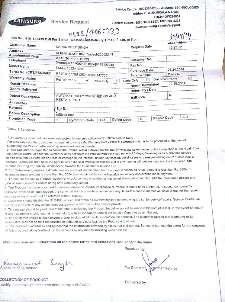 the service center and the services provided by the service center. I also contact with the Samsung customer care center lot of times for the same but till now i am not getting any support from Samsung customer care as well as from CEO Mailing Team they people transferred my call into the escalation department