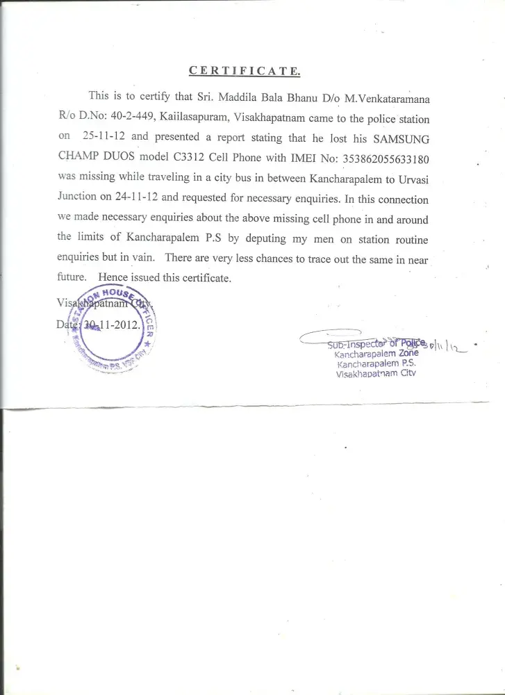 I lost my Samsung Duo Model No.C-3312 with IMEI No.[protected] on 24-11-2012 was missing while travelling in a city bus in between Kancharapalem to Urvasi Junction. I lodged a complaint in 5 th town police station. They issued a certificate stating that they made necessary enquiries about the above missing cell phone in and around limits of Kancharapalem Police Station by deputing their men on station routine enquiries but in vain. I am sending herewith copy of purchase bill and certificate which was issued by 5th town police station for necessary action.