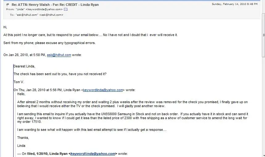 "FACTS of my experience! ***FACT: When I ordered a TV it was listed as in stock and would go out in 24 hours. ***FACT: 2+ months went by and no tv. ***FACT: They told me they can not change their website. I don't understand a company that doesn't have control of what is on their website. ***FACT: **********THEY LIE TO CUSTOMERS**********. I ordered a TV that they said was in stock and it was on back order for 2 plus months. I had numerous phone conversations where they promised me things they never delivered. **FACTS: They promised (I have email proof) that if I remove my horrible review of them they would give me 200 to pay for a tv with another company. They responded (I have email proof) that the check was in the mail. They told me I would get HDMI cables mailed to me when I canceled my order with them. ***FACT: I waited 2 months before I canceled my order with them. I waited 3 weeks after they promised me a check. I canceled my order and never received HDMI cables ***FACT: This company lied to me via email and phone on numerous occasion with no qualms. ***FACT: I reported them to BBB.org ...DO NOT DO BUSINESS WITH LIARS Please...