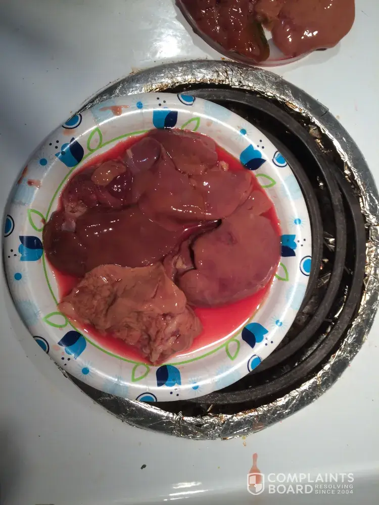 It has been over a month and after seeing all of your "we take care" commercials, I convinced myself that it must have been a rare thing, so today I bought them again and these are as bad as the others This time I want to let you know and I do have pictures. The pictures don't do the livers justice, however. The dark places in the pictures are dark, slimy, green. These will be going back to the store in the morning.