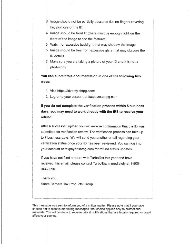 I filed my tax return through this company mid February 2020. After submitting my return electronically I was asked to provide my government I.D. which I did and thereafter my filing was accepted. The IRS send my return on February 20th to Green Dot which is an entity afiliated with Santa Barbara Tax Group, afiliated with Turbo Tax. They intern were suppose to collect their processing fee and forward my refund to my bank account via direct deposit. When I checked with them, they put a hold on my account stating that there is suspecious activity and requested I email them copy of my government I.D. again. I did this a week from today 03/05/2020. I called and spoke to one of their reps and was told that it took a week to resolve this matter but I haven't heard back. I called today but they have an automated answering system that keeps you on hold for a length of time then disconnects the call. This is the first time that I filed my return online using this company and my last, nor would I recommend it to anyone. The service is horrible and their online system is the same, you simply don't know what is going on with your money.