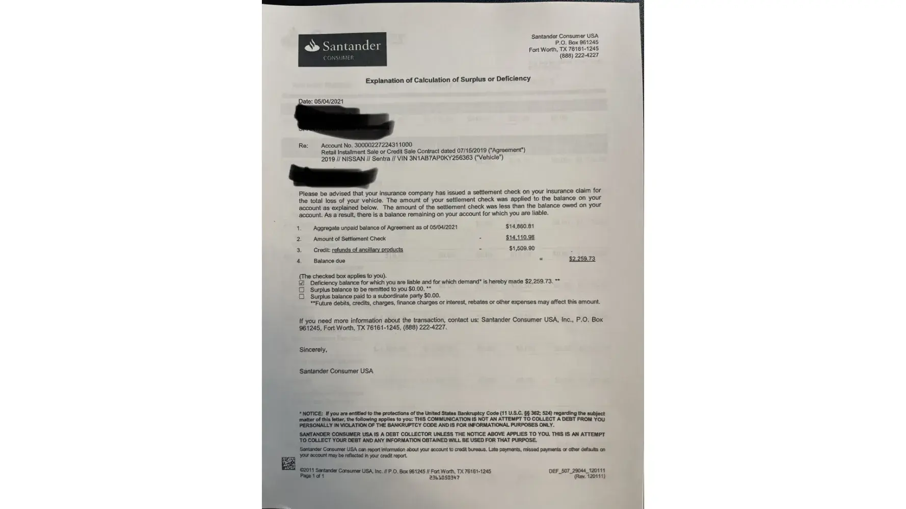 Santander Consumer USA is saying that I still owe them almost $10,000.00.