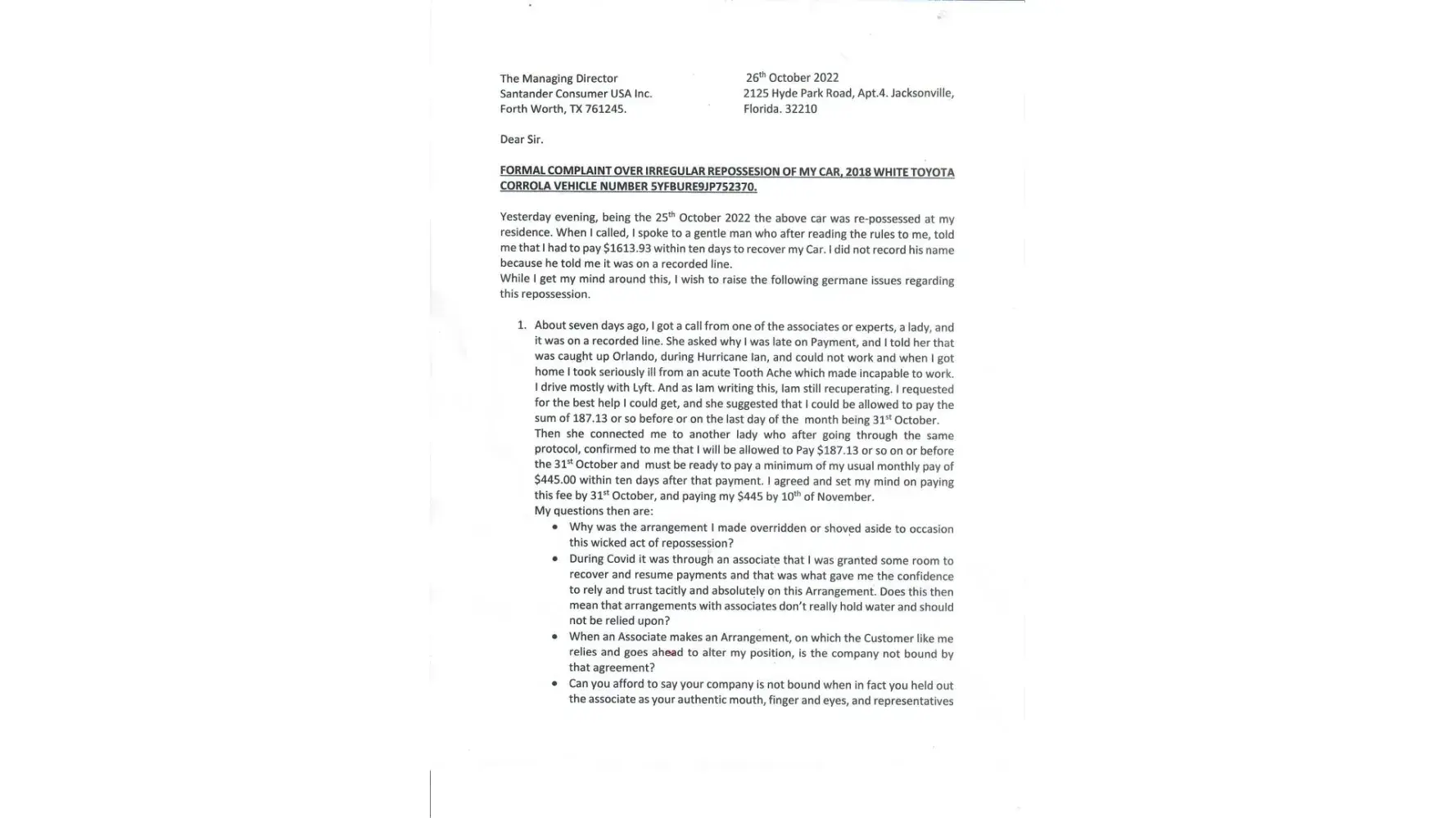 1. About seven days ago, I got a call from one of the associates or experts, a lady, and it was on a recorded line. She asked why I was late on Payment, and I told her that was caught up Orlando, during Hurricane Ian, and could not work and when I got home I took seriously ill from an acute Tooth Ache which made incapable to work. I drive mostly with Lyft. And as Iam writing this, Iam still recuperating. I requested for the best help I could get, and she suggested that I could be allowed to pay the sum of 187.13 or so before or on the last day of the month being 31st October.