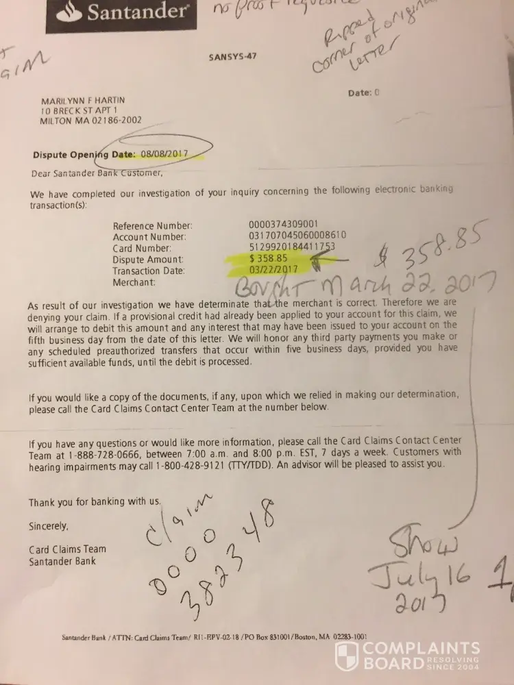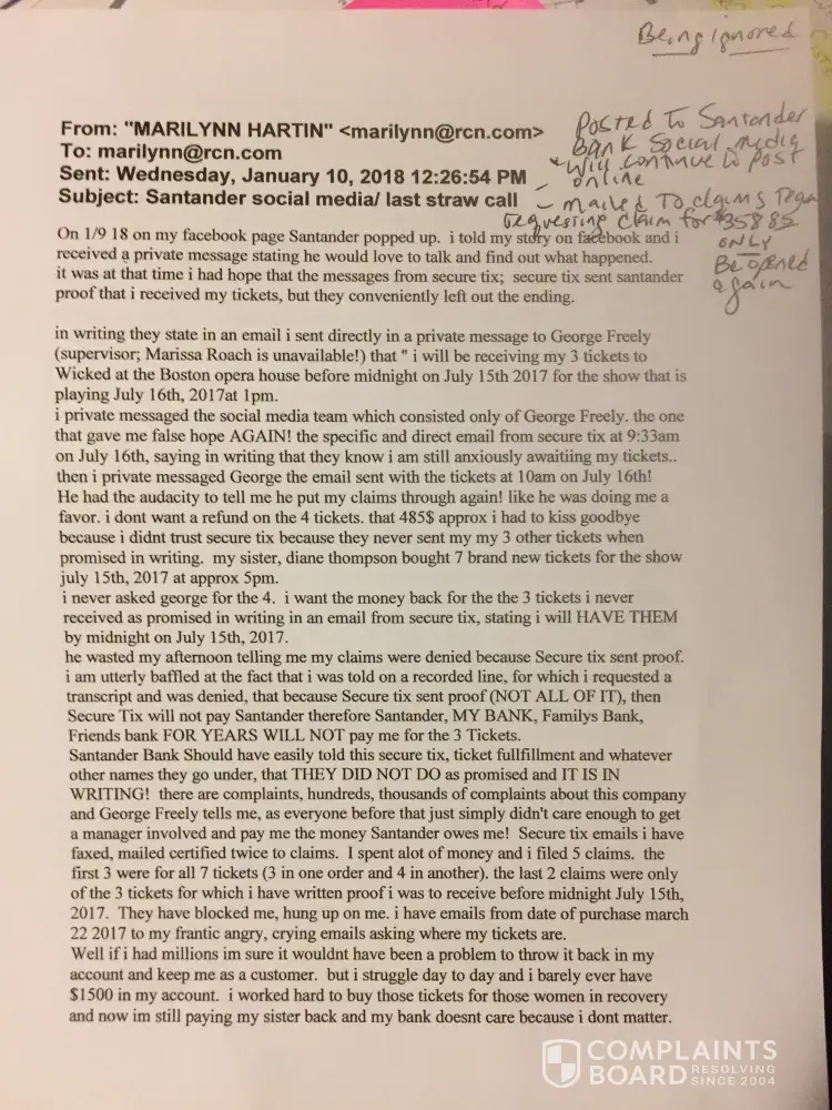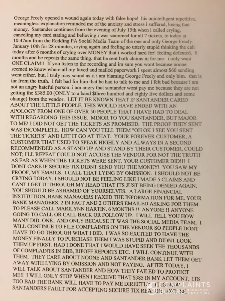 I was now fearfulvthat I was scammed by 'secure Tix' aka 'ticket fulfillment' I saved my pennies to get these girls, in recovery (2 pregnant) to the show of there dreams.! When the other 3 (order 1269913) I looked closer at the 4 tickets. They said ticketMaster, issued to someone else with different seats from what I was told. JULY 15, 2017 at approx 5pm I called Santander crying to cancel my card, that I had been scammed. Oh was desperate and talked with my sister. Diane Thompson my sister, purchased 7 tickets for the show the next day for me! (Ticketmaster: conf# 32-55776/NY2 $1048.90) You'll see in writing my remaining 3 tickets they say are expected to arrive by midnight July 15, 2017. You'll see the promise in email dated July 15, [protected]@5:56 pm. You'll also see email dated July 16, 2017 at 9:33AM telling me they knowing still 'eagerly awaiting', and a final text at 9:51 on Juky 16th, 2017 (Show is July 16 @1pm) stating 'you must download and print out the document.' I'm in Boston! Where! They promised by midnight. The first 3 claims I did included all 7 orders, 2 purchase (466.15 and $358.85) after being denied 3 times, I realized it was only the 3 I didn't get as promised. I bought I was scammed from secure Tix for the 4 as well because they didn't come through for the 3. I have written proof they promised the 3 by midnight July 15, 2007 I requested 2 new claims for ONLY $357.85. (case 1593079 case 1633299) both were wrong and still included the $476.15. I was waiting for ANY response from my faxes(done at branch of MY proof, and my 2 certified letters with my emails and story inside) NOT one of those people called me, responded, cared about anything I was telling them. No one knew where my letters went (40 pages) nooone knew or cared where faxes went. I was Promised over and over I would get a call! Branch mgr in Milton spoke to claims 4 times and emailed a Sebastian that promised me yet again, through store mgr he would call. Nothing. Not a word. Santander pops up on my fb page. I write complaint. George freely pm'dme. Said he'd call the next day. I had hole again that I would see my $358.85 (paying my sister back still) he listened while I vented at the end I thanked him. He stopped and said he just put the claim in again for me! I asked him for what? He actually told me 'for 476.15 and 357.85' I started crying and yelling. He gave me hope but listen to a word I said. I only want what they promised and failed to do. That promise in writing would hold up In court for Gods Sake! George then said that the vendor sent proof tickets were sent! I reminded him of the promise in writing and the email the day of the show at 9:51am (not even tickets: they still need downloading) George told me 'BECAUSE THE VENDOR DIDNT PAY US & SENT PROOF, WE CANT PAY YOU!'. I'm the little guy that doesn't matter to Santander. You should stand by your customer. I will continue to talkvand write about this until I get what was promised tickets for 3 by secure Tix sent before midnight in July 15th, 2017 I would like my $358.85 back. I don't care that secure Tix thinks they're right. They have a promise in writing. they failed to come through and Santander needs to stand up for me. Claims Dept never wrote notes so the next I called over time had a clue as to what was going on. The last 2 claims I requested be for only $358.85 and they still got that wrong. No one knew where my 2 over 30 page faxes went (bank mgr got # from claims Dept) or where MY PROOF IN 2 certified letters went. (Address bank manager got for me to MAKE SURE MY PROOF WOULD BE HEARD.