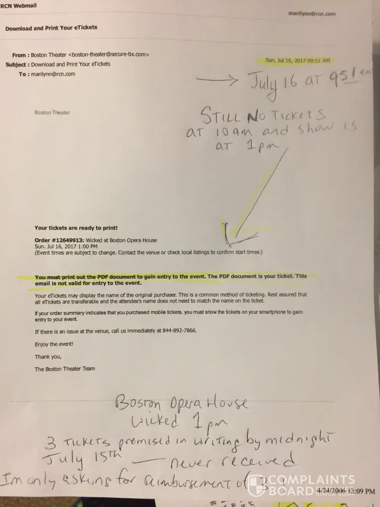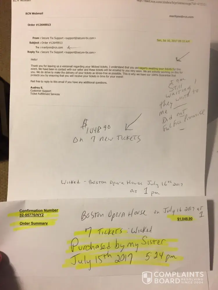 I bought 7 tickets to a show. Qty 3/qty 4 on March 22 2017 for the show Wicked: Boston opera House JULY 16th at 1pm (daytime show). 4 came right away (order12649914 for $476.15) 3 never came. From March to JULY I tried emailing (attaching a few Emails here)calling, chatting online. They promised and stated in writing I would have them by midnight July 15 2017. I was frantic at that time: still no tickets, blocked from phone.
