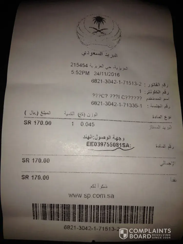 Posted on 2015-10-13, at Buraidah Central Post office - BURAYDAH Still document is held at Jeddah Central Post office - JEDDAH Tracking number of the courier: RR015704655SA Receipt number of the courier: [protected] Wrote a complaint through the website of the Saudi post on 26.10.2015, its ticket number is [protected]. No reply no action to date on my complain. So I request you to please look into the matter because it is very important documents. And deliver the document at earliest. Thanks & Regards Syed Khizer [protected]@rediffmail.com