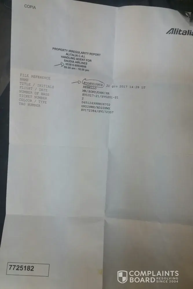 I and my family embarked on our 9 days vacation to Italy on Saudi Arabian Airline SV1017 to JED and SV201 JED to FCO on 21stJune, 2017. While checking in we were told that the baggage can be collected at FCO airport. But, on reaching FCO airport after waiting for more than one hour we realized our baggage was missing. On inquiring it was told to us that our two baggages were still in JED airport and the next flight from JED to FCO was on 24th June. They asked us to lodge complaint and assured us that they will deliver the baggage on 25th June at Ramda Naples. They also gave us a contact number asking us to contact for compensation.But, we never ever got connected whenever we tried.Since we were constantly travelling follow ups were done locally by acquaintance and after several follow ups we received baggage only on 27th June noon at Florence!