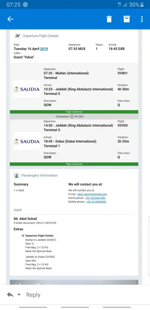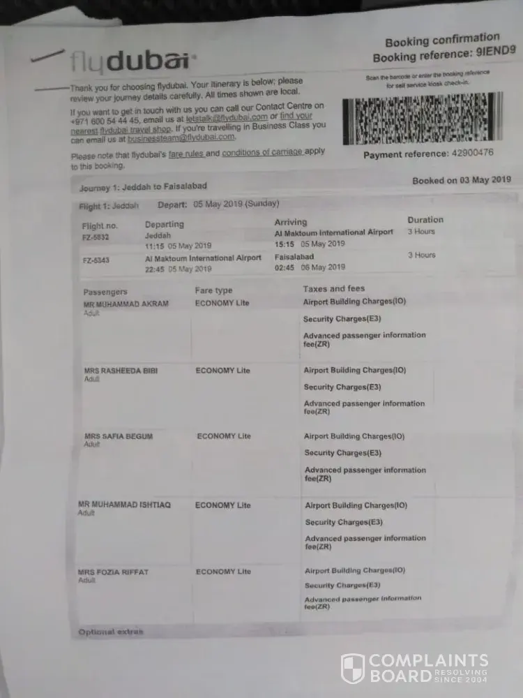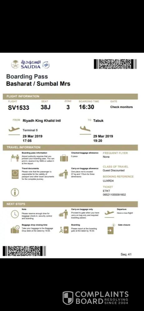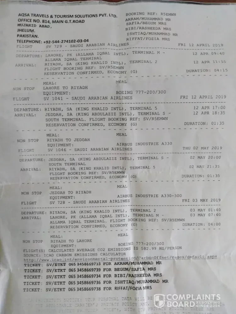 My name is Muhammad Akram living in Sargodha (Pakistan). I have booked the ticket to Travel Saudi Arabia Via Riyadh on 12th April 2019. My booking Reference is R5EMWN. We were five persons named as