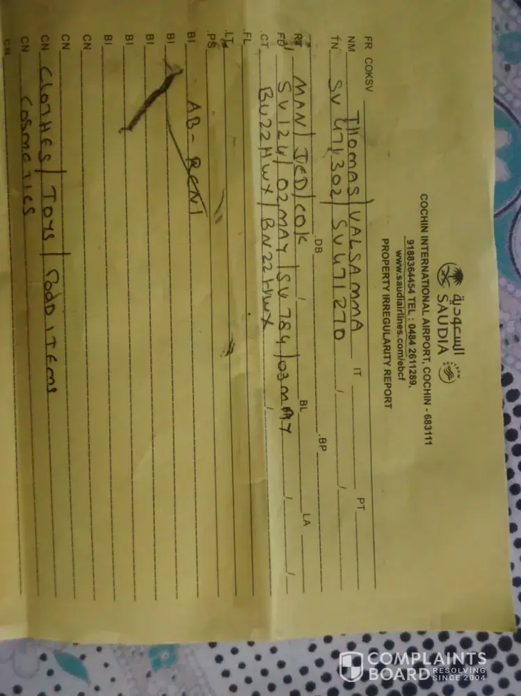 Regards to missing of her baggage whilst traveling with Saudi airlines. She traveled in on 02/05/2019 from Manchester to Kochin, booking number NN7012932360102, PNR KUSQ27,