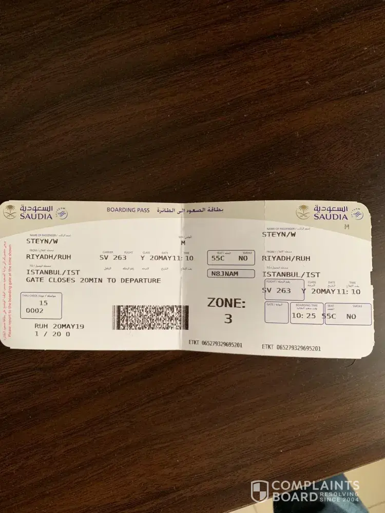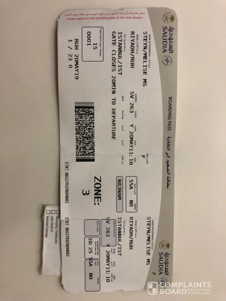 My son and daughter in law (Willem Hendrik Hermanus Steyn and Melise Steyn) came to visit my husband and I in Riyadh en route to Istanbul. Their flight (SV 263) was supposed to depart from Riyadh airport at 11.15 on 20 May. On the information board it was indicated that the departing gate was 23. They stood in the queue, and waited a long time for the gate to open. They checked the information screen several times, but the gate remained 23, so they waited. When they finally had to submit their boarding passes (see attached), they were informed that the gate changed to 25 and that the flight has already left. When inquiring who could assist them, they were told to go to Saudi airlines' head office in Riyadh to file a complaint and to see whether they can be refunded.