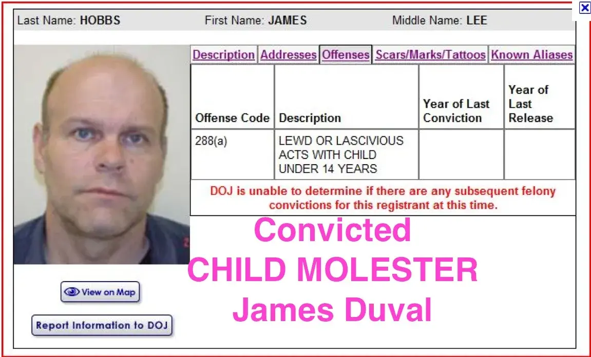 James Duval is a registered child molester using a fake name. His real name is James Lee Hobbs and if you go to www.familywatchdog.us and type in james hobbs, his real name, or James Duval without entering a state because he doesn't list his address (which is illegal) you will see the photograph attached below with his photo and a list of lewd acts he ha...