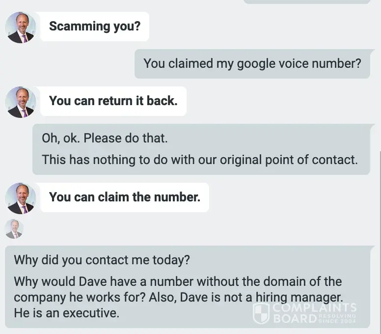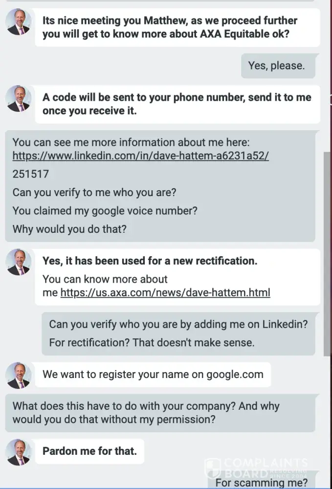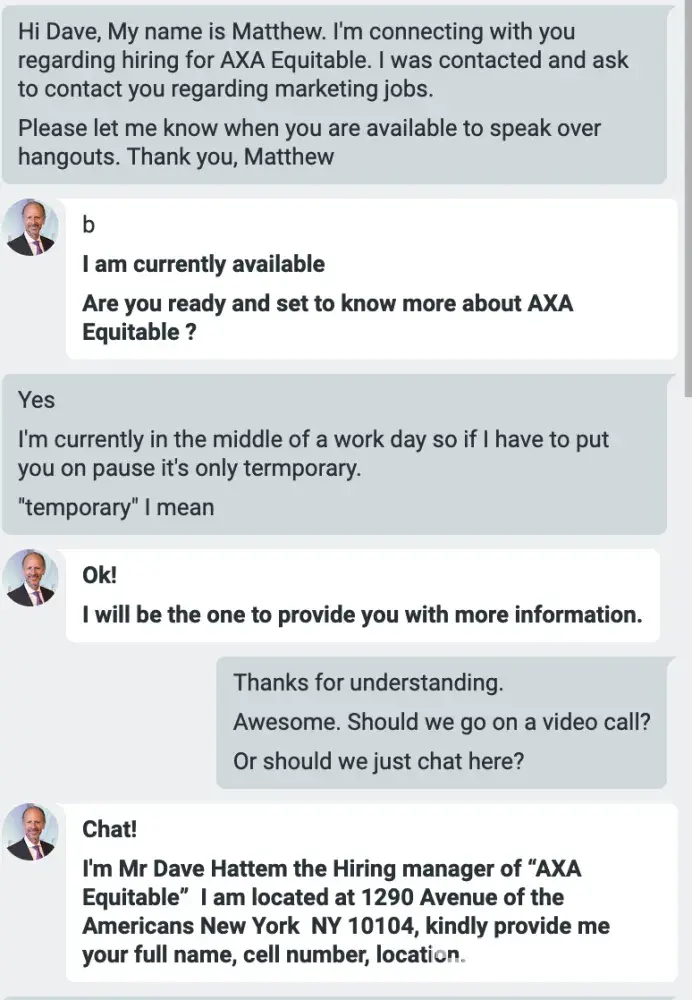 Someone impersonating being a representative of AXA Equitable and Dave Hattem as a hiring manager from the email dave.[protected]@gmail.com and the phone number [protected] contacted me to do a job interview. They wanted to verify my number, address, full name, and sent me a google verification code to claim my google voice number. After I said they were...
