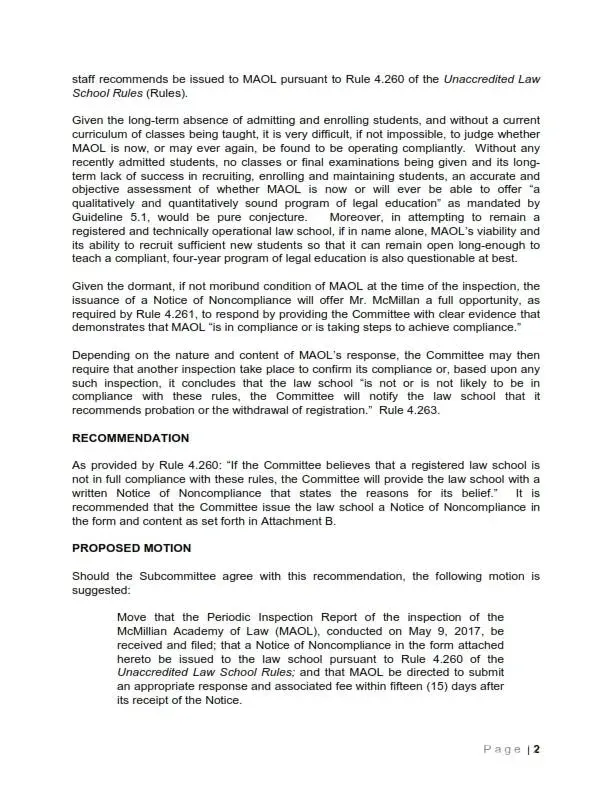 2018: State Bar of California shuts down McMillan Academy ofLaw [after finding it never had a single graduate, law books out of date by years, and only three students enrolled in twelve years]