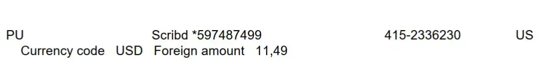 Merchant Name:SCRIBD *628592973Merchant Address:SAN FRACISCO, CA, 941070000Transaction Method:Card Info Stored by MerchantCategory:Digital Media, Books, Movies, Music (Digital Goods - Media, Books, Movies, Music)
