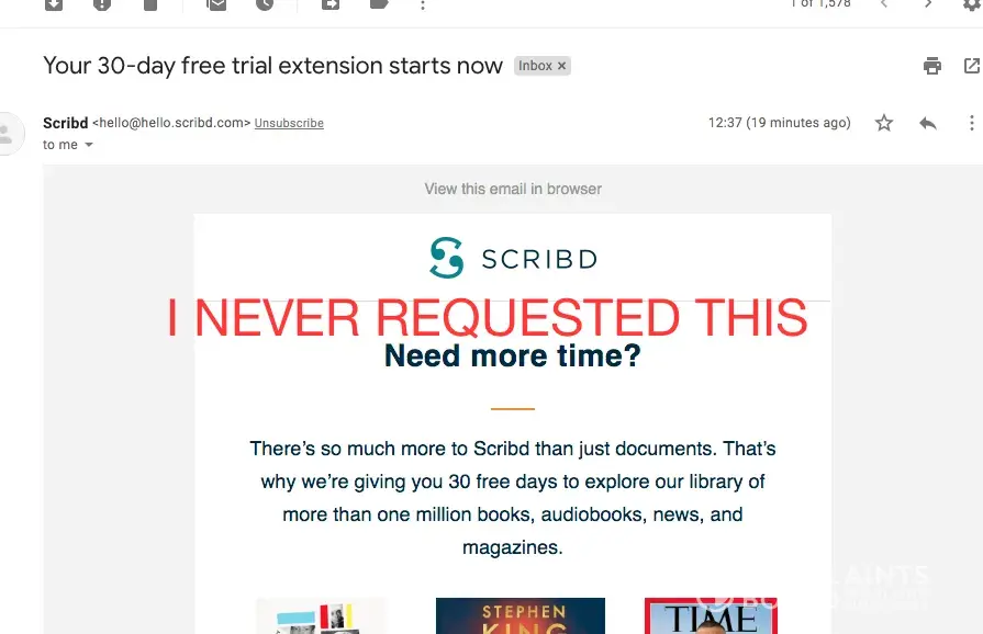 I couldn't even find a registered Scribd account under my email, nothing from them till got mail from Paypal, noticing me that Scribd charged me. After that, i see a lot of people were scammed by this website