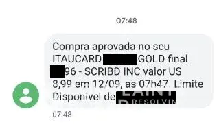 Your credit card ***** was used to make a Purchase of USD 8.99 done at Scribd Inc on 31.08.19 at 15:33:49 hrs.
