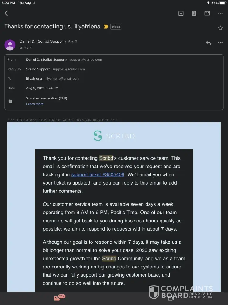 I'm complaining in regards to unauthorized credit card charges for August 2021 to my debit card and Scribd has been trying to charge my debit card since April 2021. I am extremely frustrated as you have been charging $8.99 a month on my debit card without my consent when I did not subscribe to Scribd Premium subscription. I had specifically address this issue through email. However, I did not receive any further feedback from my support ticket #3505409 and found out that I am still being charged even though I do not receive anything from you or use any of your services. I'm requesting a full refund and cancellation for my account. My email which I had created account for Scribd is [protected]@gmail.com. I expect to hear from you as soon as possible. You can reach me at [protected]@gmail.com.
