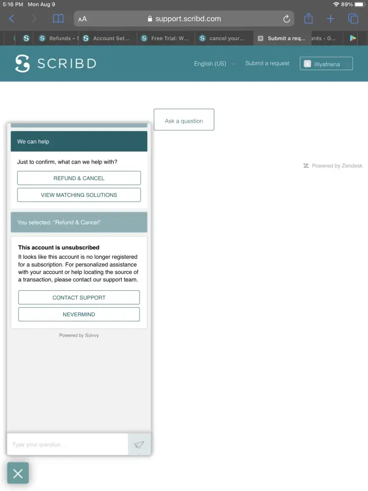 Desired outcome: Complete cancellation of subscription to Scribd and complete refund