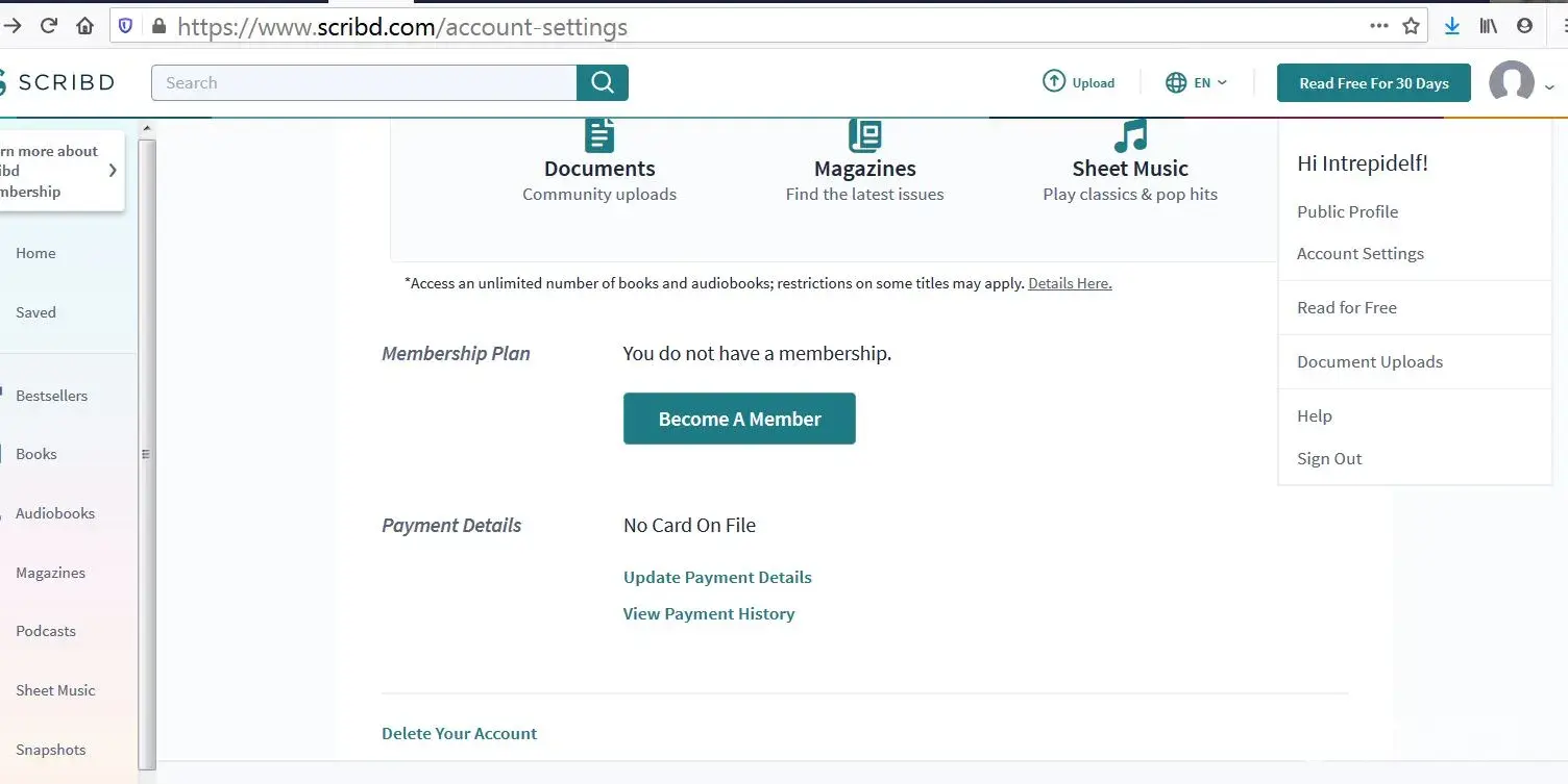 I went into my account at Scribd and it states I do not have a membership, nor is there history of payments, etc. I have screen shots to prove. In fact, when I click on links it takes me to a page to sign up for membership!
