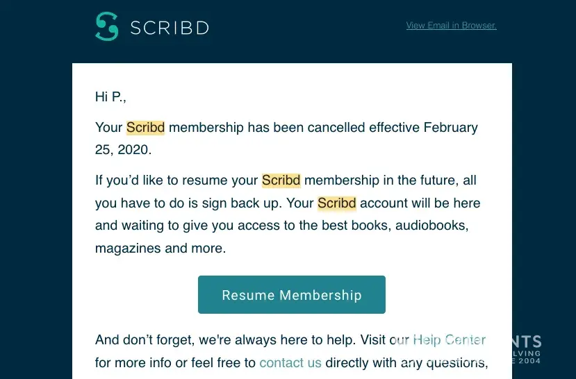 I recently noticed my Scribd subscription was not cancelled and Scribd has been charging me for a year despite sending me an email confirmation that my account was closed.