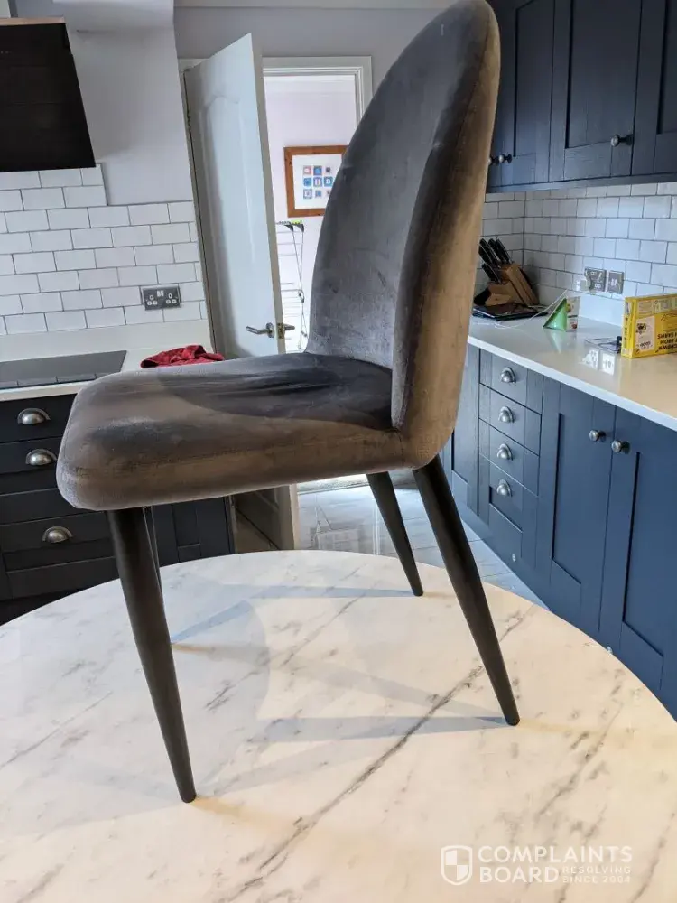 At the end of last year one of the legs collapsed and broke off. I have photographs of the damage if you want me to send to you. When I look at the chairs I see an inherent fault. The legs are made of aluminium and are at an angle. Over time these legs will collapse. I would like my money back or the fitment that the legs are attached too. When you respond I wish you to discuss the matter with my Father as I am so angry and emotional to deal with this issue. My Fathers mobile is [protected]. His email address is ronald. [protected]@btinternet.com