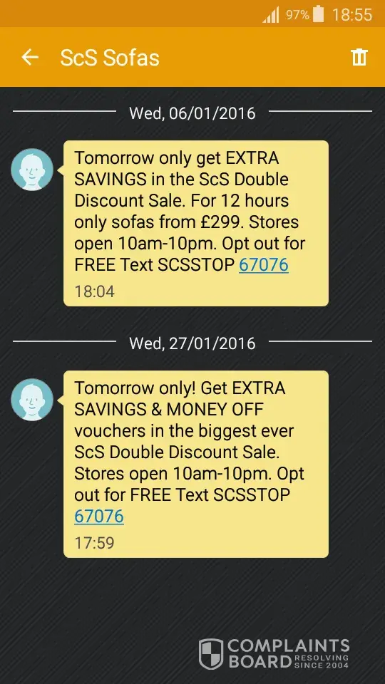 ScS Sofas unsolicited spam text messages to mobile [protected]